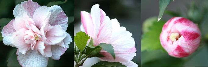 帰りにうちの近所のお寺の境内にピンクの可愛い八重のムクゲを見つけました。正面から見ると薄いピンクなんですが、裏から見ると一番外側の花弁だけ濃いピンクと白いピンクのストライプになっているんです。そして、その蕾がまた可愛いいんですよ。3つの写真を並べてみました。