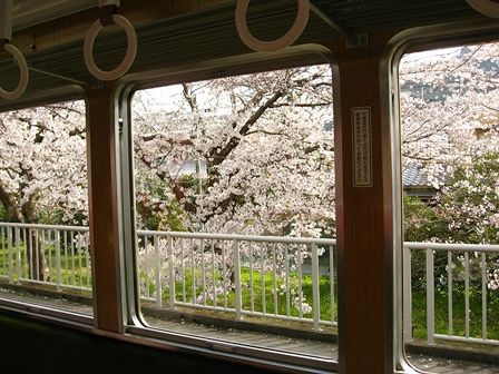 阪急電車の車窓から、満開の桜が。