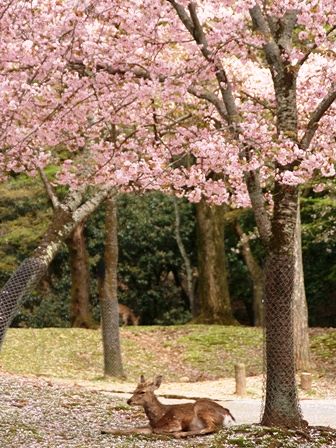 満開の桜の木の下で一頭の鹿がじーっとしてました。気持ち良さそう。