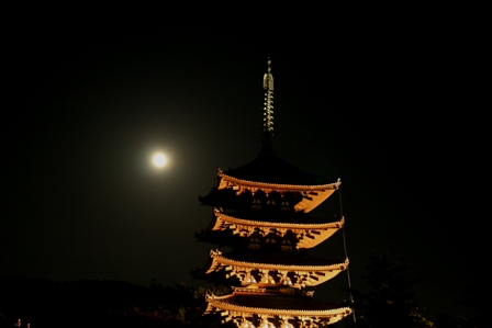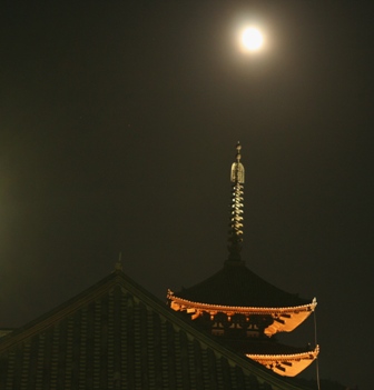 昨日、主人が休みで外出してまして、帰りの電車の中で寝てたら、主人が急に私を起こすので、もう奈良に着いたのかと思ったら、何と窓の外に綺麗な満月が!もうクタクタだったのに、急に元気になって、あの満月を撮りに行く事にしました。一番、近いのは興福寺の五重塔。あそこなら絵になると考えました。実際入江さんの写真にもありますしね。
