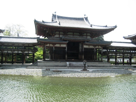 中の藤棚の藤は入り口の藤とは違って、長いやつです。良く舞妓さんがかんざしで付けてる様な細長い紫と白が混ざったやつです。残念ながらこれは満開じゃなかったんですよ。上の方だけ咲いていて、これからですね。これが満開だったら、見事でしょうね。ちょうど良い時期に来るのって難しいですね。鳳凰堂はさすがに見事でしたね。威厳があって、りっぱです。