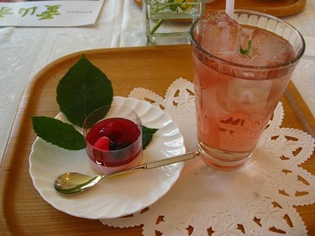 園内の喫茶店でバラのケーキとバラのジュースを頂きました。