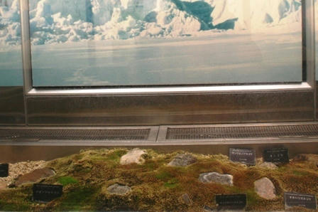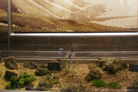 サギソウを高山植物室で見た後、その奥にある極地植物室にさっそく行きました。そこはもう冷蔵庫の中のようでした。そこで、南極と北極の植物が再現されているのです。意外だったのは、南極の方がペンギンさんもいるし、いろいろ草花があるのかなあなんて思ってたのですが、実は南極は苔のようなものが少しある位なのです。そして、北極の方は緑の草が生えていて、紫の小さな花も咲いているのです。これはちょっとした驚きですね!
