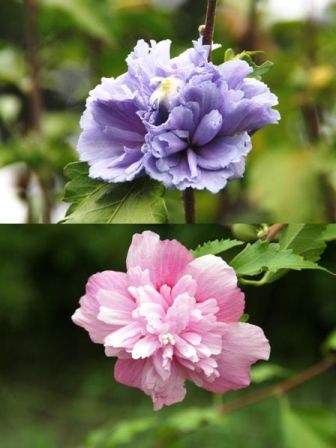 (上)紫色の八重のムクゲ (下)ピンクの八重のムクゲ