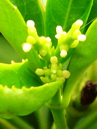 千両です。これは、何と花です。白い粒がめしべで緑の粒がおしべなんだそうです。