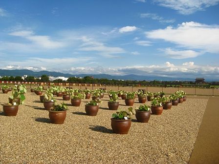建物の前に蓮鉢がズラリと並んでます。花は全然咲いていませんでした。(夕方ですものね。)