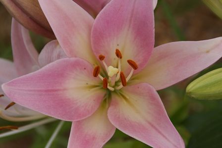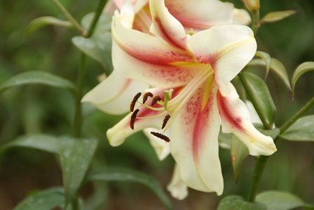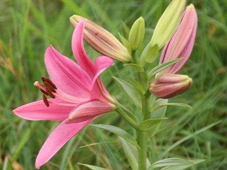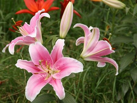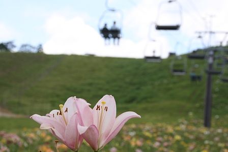 ペアリフトの下にペアの可愛いピンクのユリが咲いています。