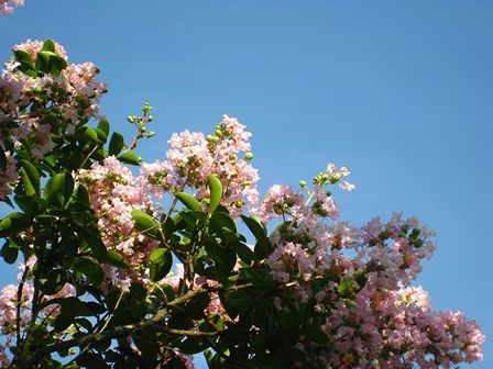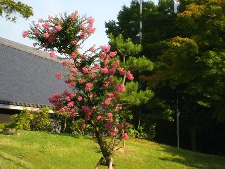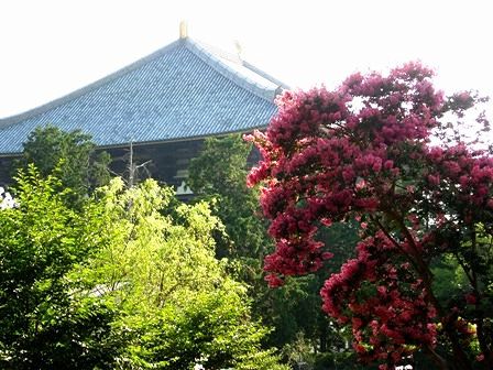 大仏殿と満開のサルスベリ 本当に満開です。でも、逆光…。