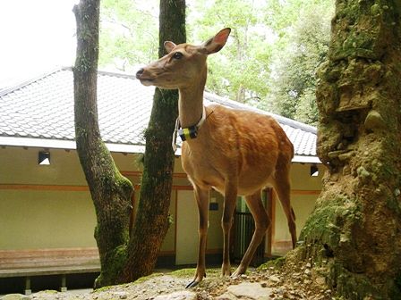 荒池園地にいた鹿さん、発信器の首輪をしています。