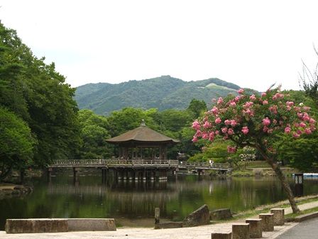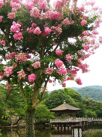 鷺池、浮見堂とサルスベリ