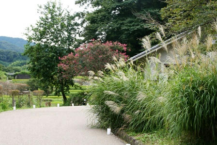 ススキとピンクの百日紅