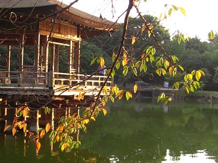 浮見堂を借景に、少し黄葉し始めている桜の葉っぱ