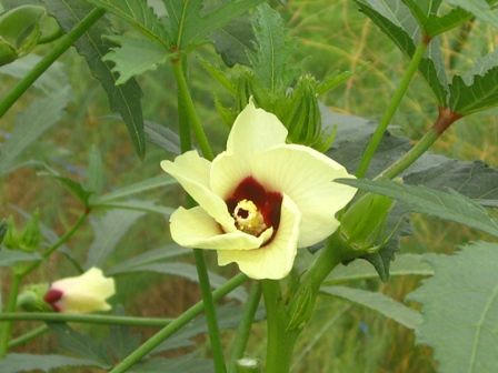 オクラの花です。オクラの実って、下から上に伸びるんですね。