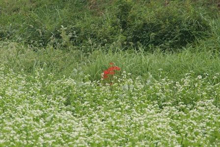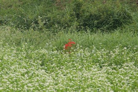 純白の中に紅一点の彼岸花が。