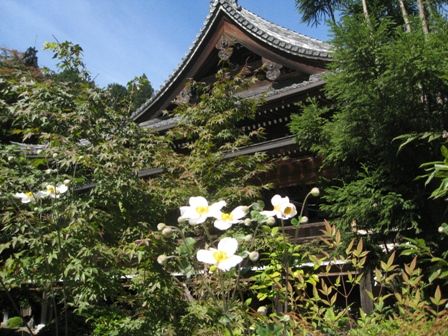秋明菊越しの本堂 定番のアングルなんですが、秋明菊が少ないですね。