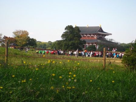 黄色いのは、タンポポでしょうか。大極殿を借景にと言うか、人ごみを借景に?