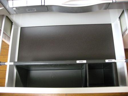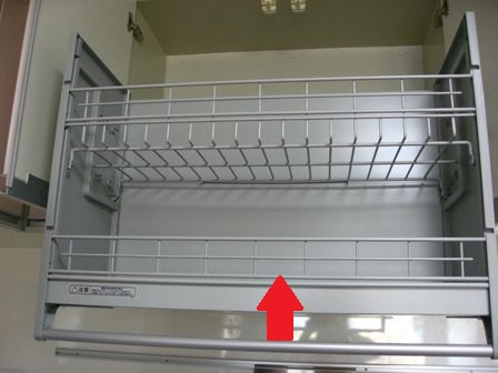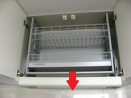 上の棚ですが、椅子に乗らないと物が出し入れ出来ませんが、これは、上下するんです。