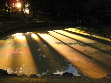 水面は汚いひょうたん池ですが、夕日が当たって、とてもきれいなシルエットが見られました。