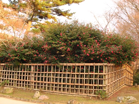 すぐ横の奈良県新公会堂のお庭は立寒椿が満開です。