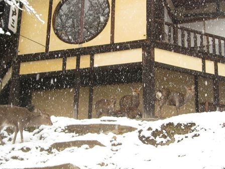 江戸三の軒下で雨宿りならぬ雪宿りをしてる鹿達