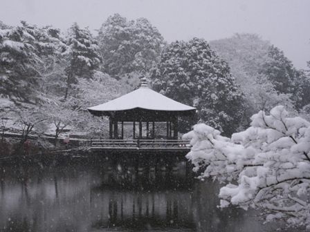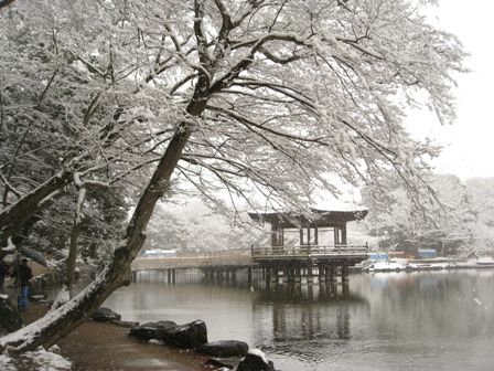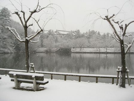 鷺池に移動です。雪の合間から浮見堂を眺めます。