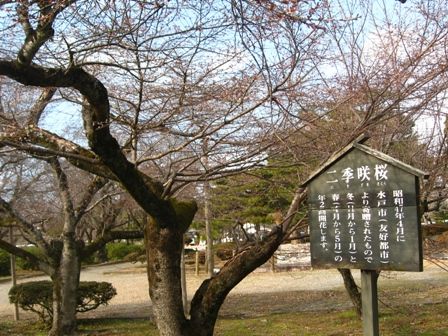 この桜は二季咲桜(にきざきさくら)と言って、昭和47年友好都市の水戸市から寄贈されたもので、冬と春の年2回、開花するそうです。