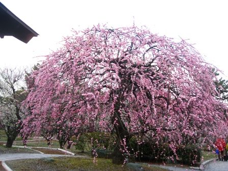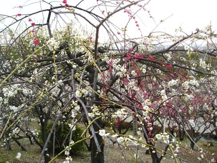 源平しだれ梅 ちょっと分かりにくいですが、同じ木から紅梅の枝と白梅の枝が出てます。