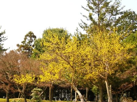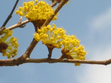三社池のサンシュユ 遠くからでも黄色が輝いて見えました。