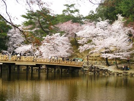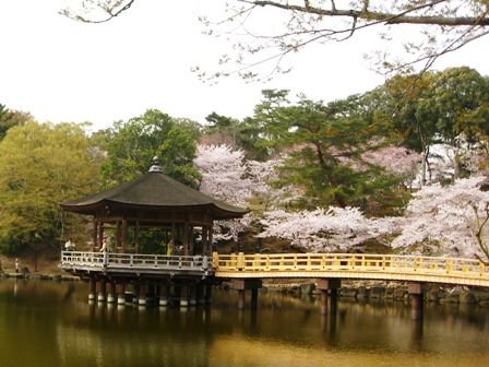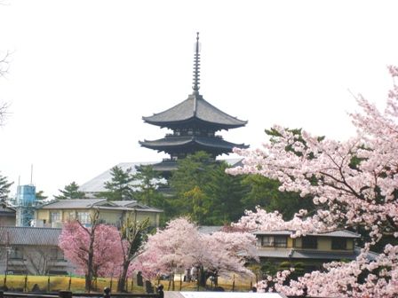 橋の上から興福寺五重塔が見えます。桜と一緒だととても美しく見えます。