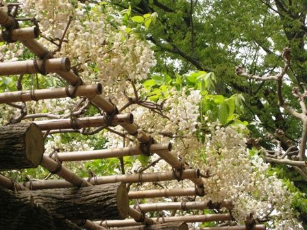 鷺池の水琴窟の上の藤棚の白藤 もう終盤