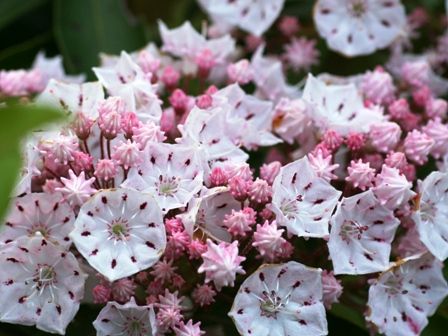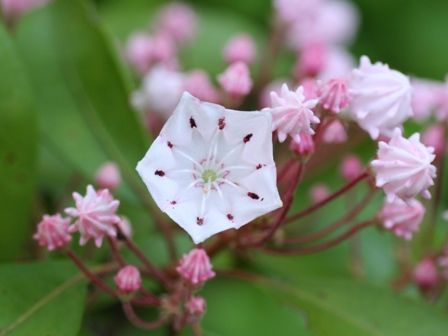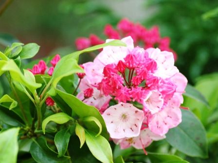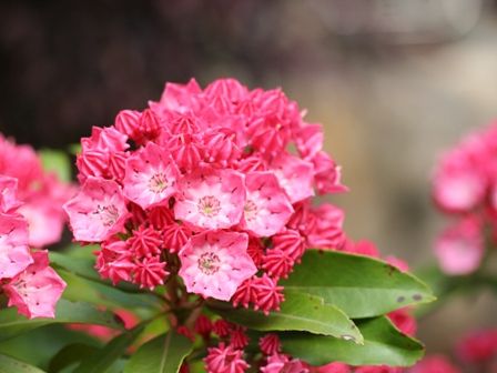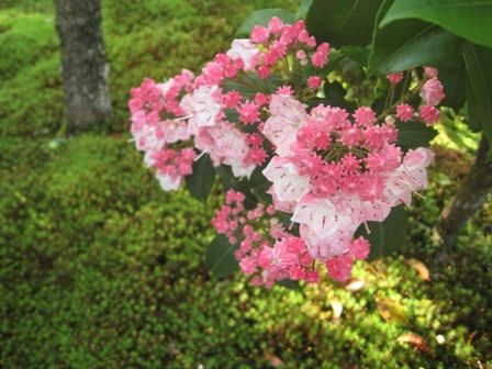 私の大好きなアメリカシャクナゲ(カルミア)が境内のあちこちに咲いていました。