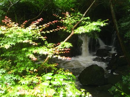 ずっと山道を歩いてるのですが、突然ゴーという音がして、見ると滝です。