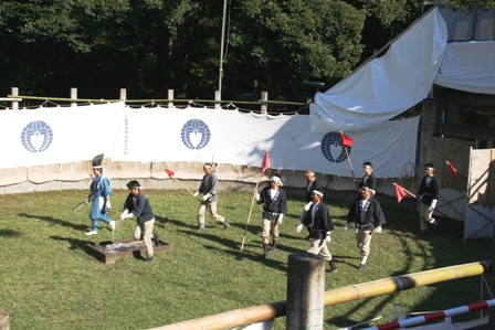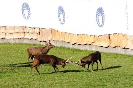 まず、会場に3頭の鹿が放されます。そこで、鹿は自由に走り回ってます。ところが、突然若い鹿2頭が喧嘩を始めたんです。角をぶつけあっています。もちろん、これは、観客へのサービスでもなければ、パフォーマンスでもありません。本当に喧嘩をしているんです。そして、長老の鹿はそれをじっと見守っています。鹿の喧嘩なんて初めて見たのでちょっとびっくりしました。鹿の野生の部分を見た気がします。やっぱり、角切りの必要性を感じました。