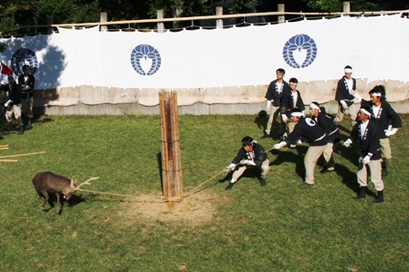 ハッピ姿の勢子(せこ)達と伝統的な服装をした神官(しんかん)が鹿の角切りを行います。
