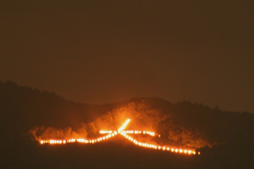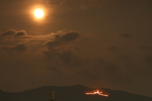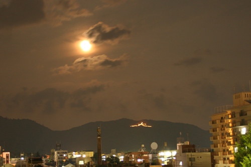 大文字焼きをまるで、照らすかのようにお月様が上で光っています。