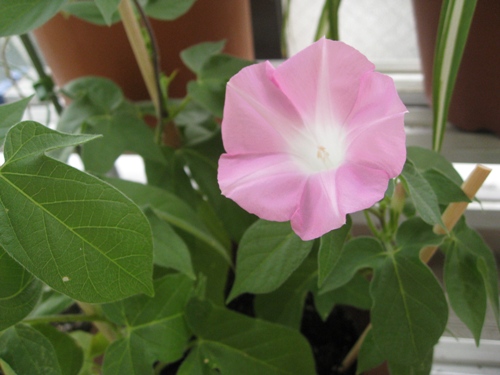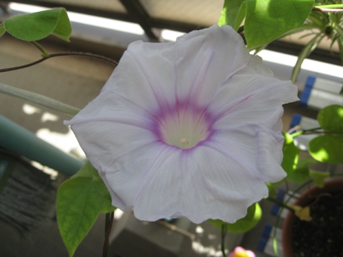 普通のアサガオはなかなか咲きません。やっと2個目が咲きましたが、これも絞りじゃないです。