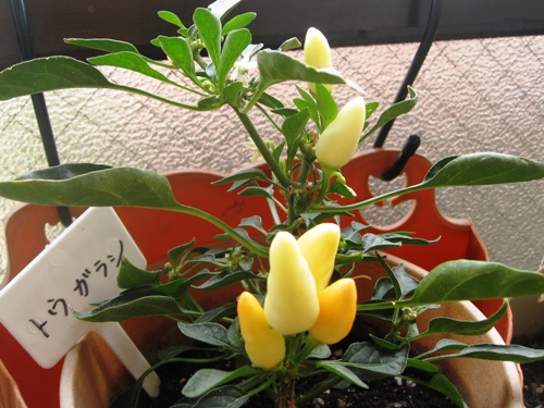 白かったトウガラシの実、少し黄色と言うか、オレンジ色になり始めました。