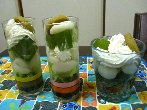 私は、寒天パウダーとグリーンティの素で、抹茶ゼリーを作りました。