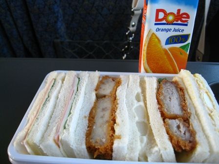 サンダーバードの車中で朝食 サンドイッチとオレンジジュース