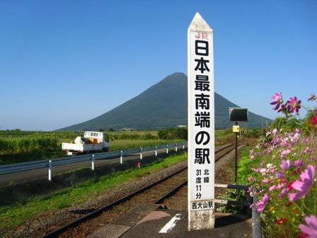 JR最南端の西大山駅です。向うに見えるのは開聞岳です。コスモスが満開です。