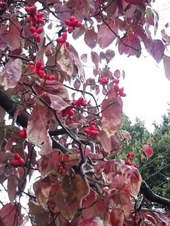 紅葉したハナミズキと赤い実 (三条通りにて)