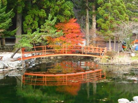真っ赤な紅葉と朱色の橋 それが、そのまま池の水面に写ってます。