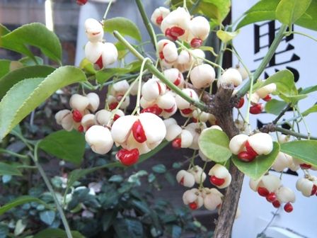 帰りにスーパーに寄ってお買い物。その隣のお店の前にこんなマユミの実が。