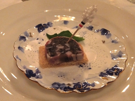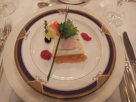 ポテトとフォアグラ、穴子のテリーヌ、コンソメジュレとトマトフォンデュ