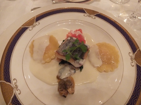 太刀魚のミルフィユ仕立てと海老のラヴィオリー冬野菜と浅利のソース