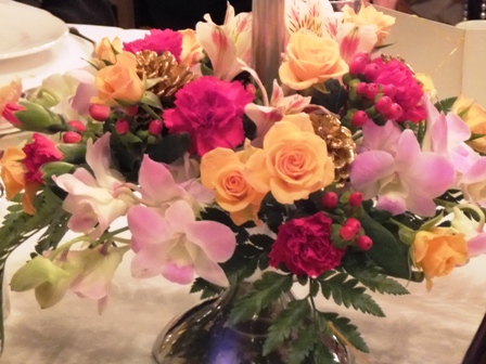 テーブルには、素敵なお花が。真ん中のローソクの灯がムードを盛り上げています。