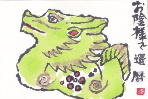 辰の置物をモチーフにした絵手紙です。ちなみに還暦は私ではなく、主人です!