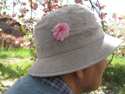 関山は椿のようにまとまって落ちます。こんな風にアクセサリーに。