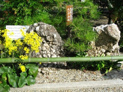 まず、さざれ石が置いてある事です。君が代の歌詞に出て来るさざれ石です。「さざれ石」は「細石」と書き、小さな石の欠片の集まりが炭酸カルシウム等により埋められ、1つの大きな石の塊に変化したものなんだそうです。確かに実物を拝見するとそんな感じです。