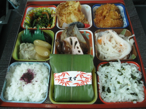 昼食のお弁当です。富山の名物のます寿司も入ってます。